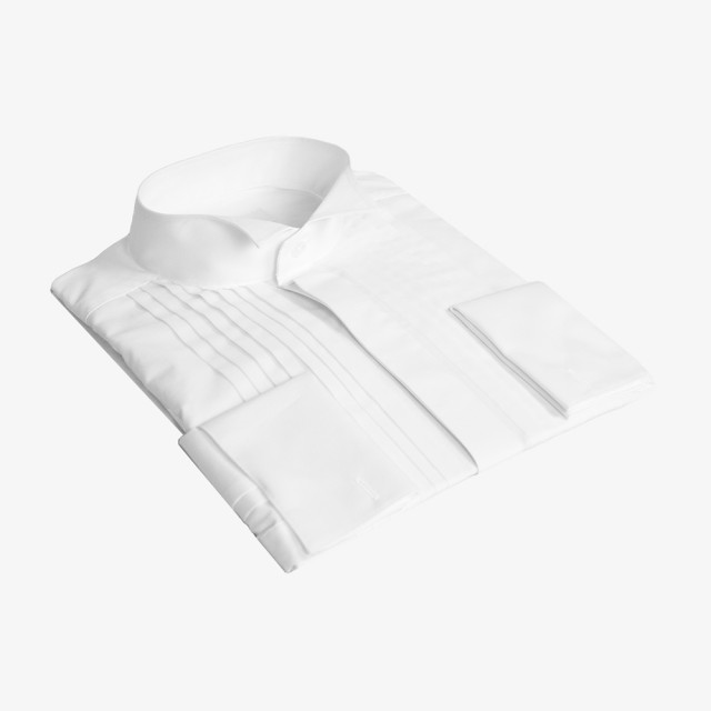Hvit skjorte med plissert bryst, skjult knepping og dobbelmansjetter.